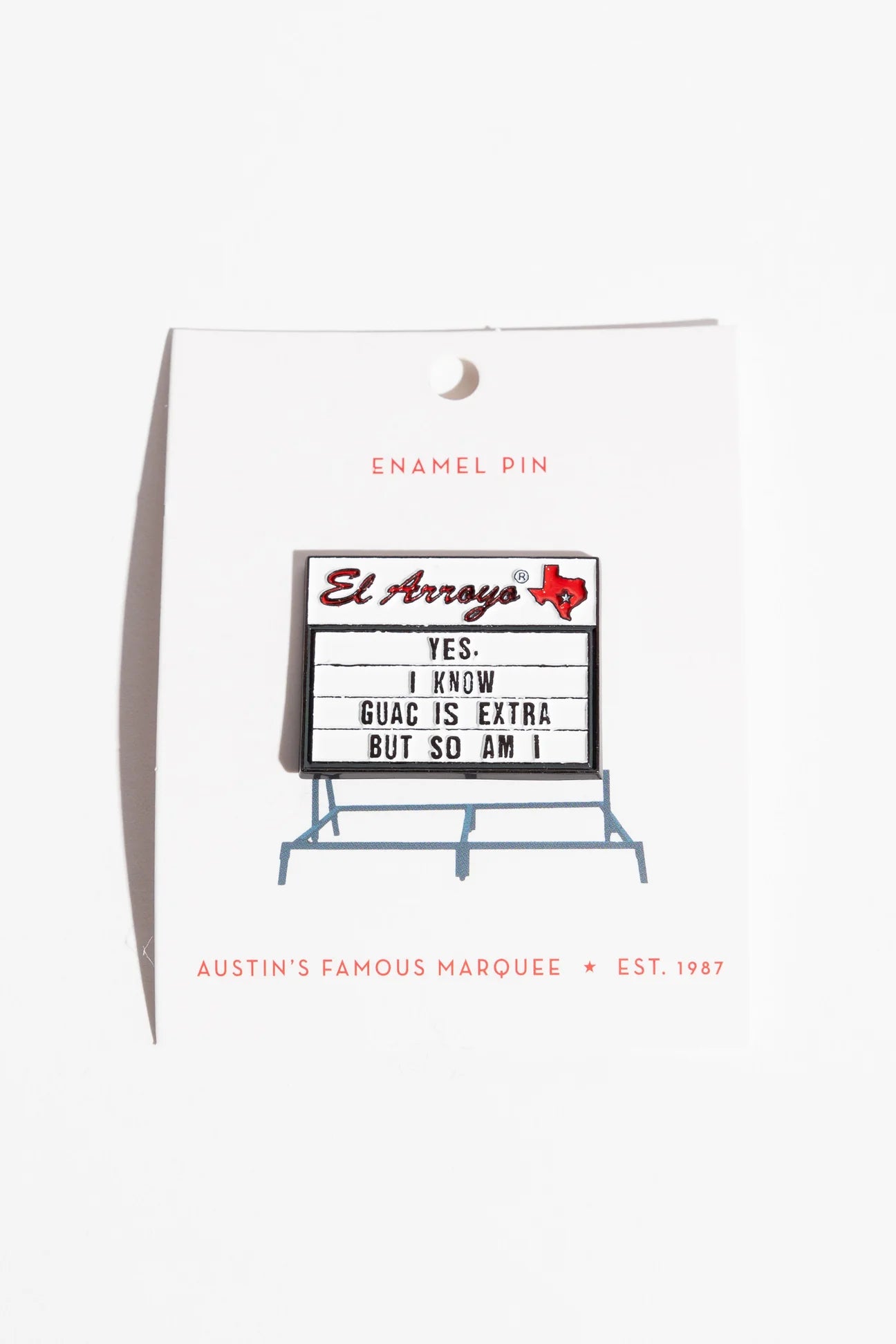 Featuring a funny message from the famous El Arroyo marquee sign, this pin will put a smile on your face. Add it to your collection and be the life of the party!