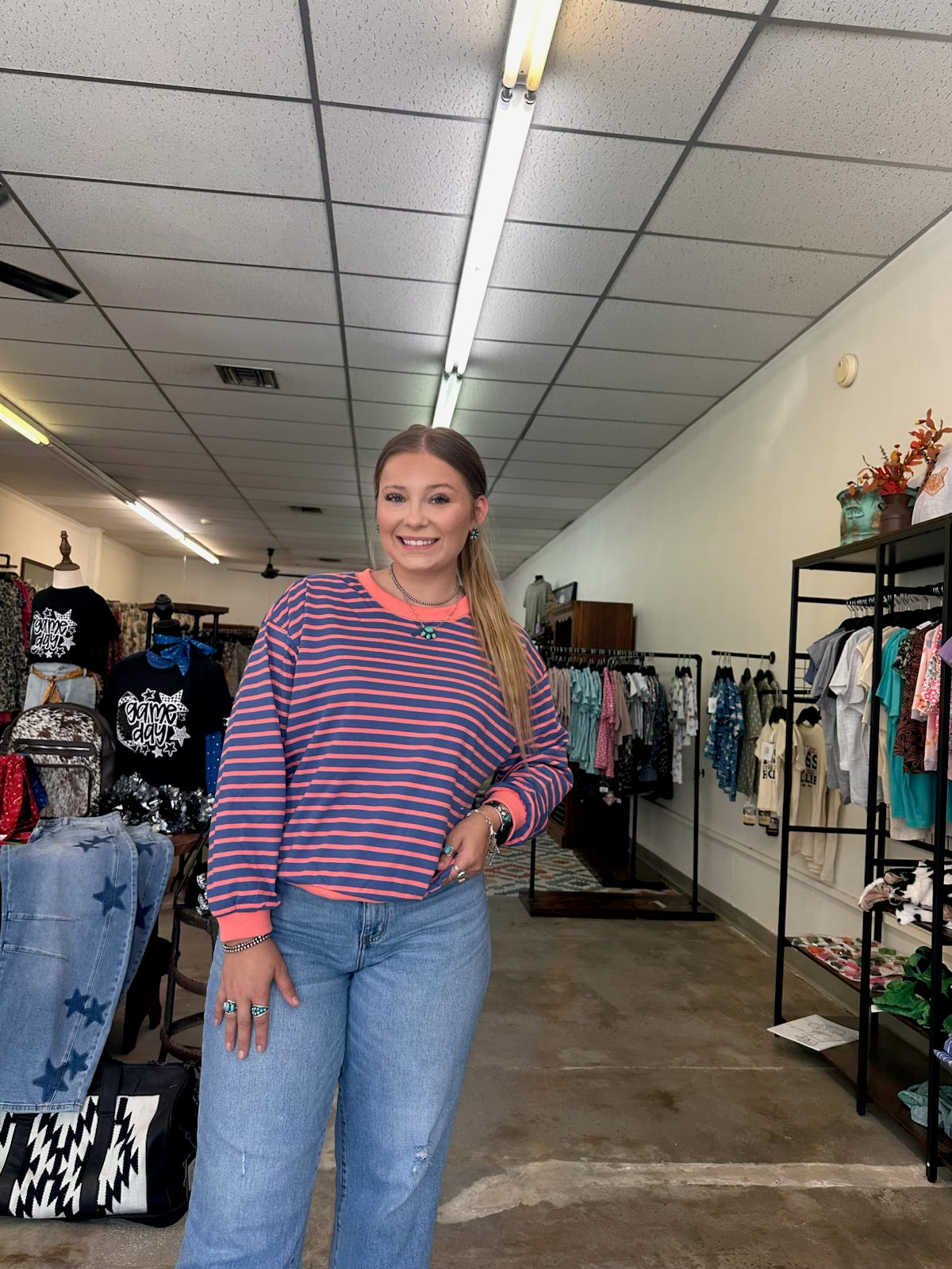 Drop shoulder stripe top with v-notche neck, solid contrast binding detail.
