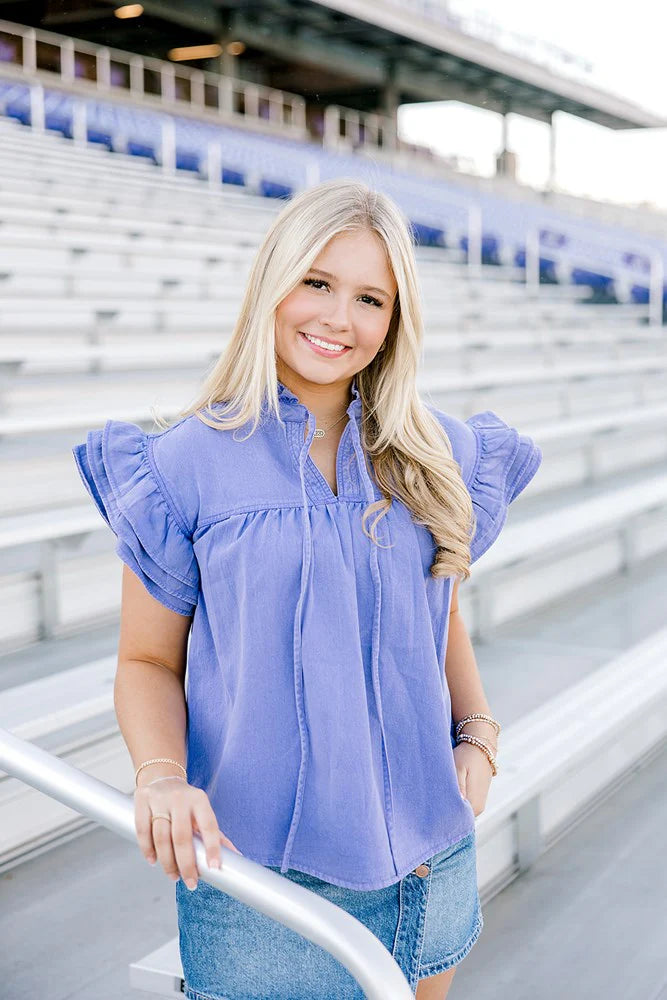 Denim is a classic, but you can now wear it in your favorite teams colors! The Marley Top is a colored washed denim with a double ruffle sleeve. Pair with denim or white for a fun and polished game day look!