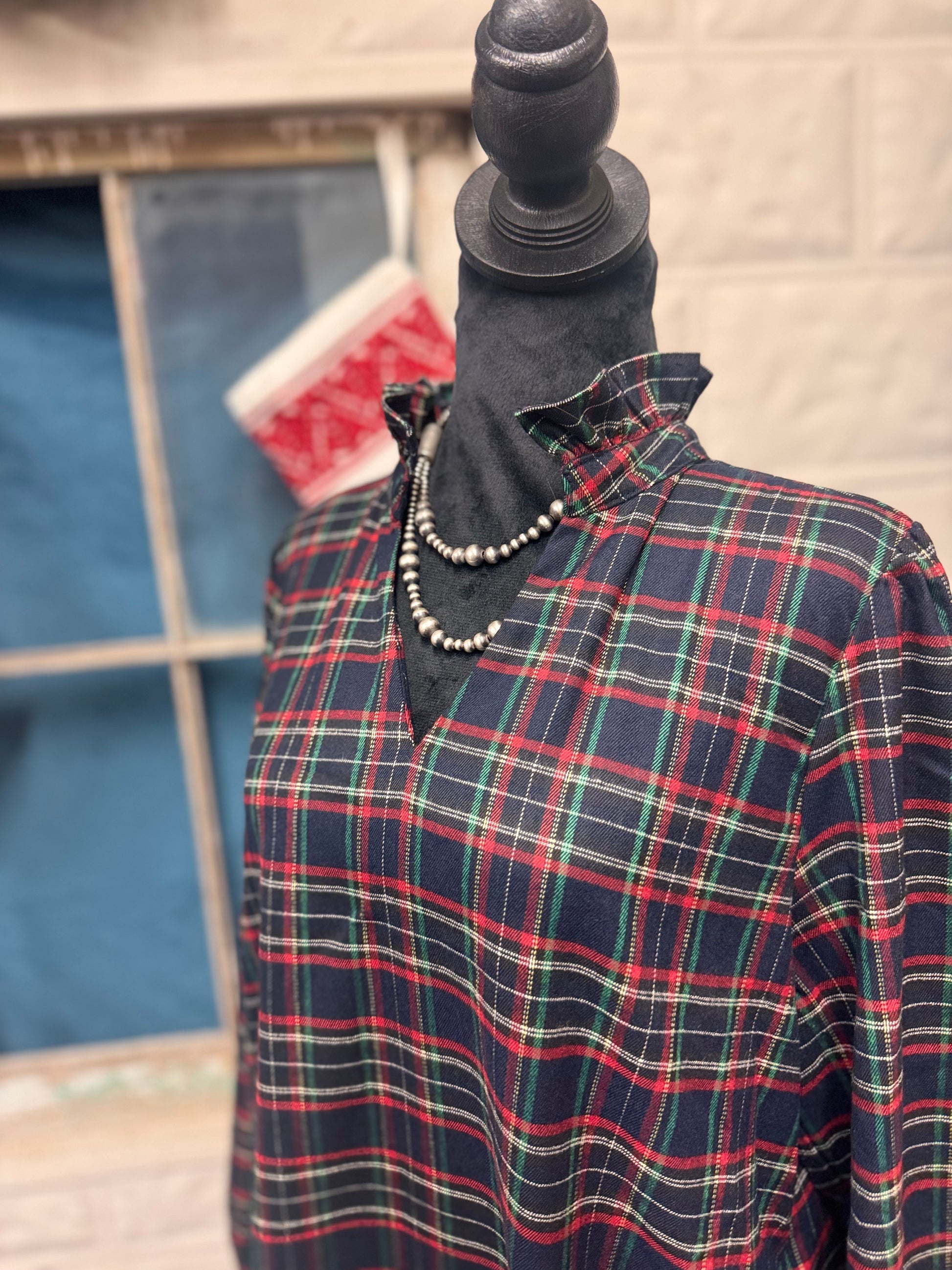 Long sleeves checker dress with side pockets, ruffled high neckline, ruffle hem.