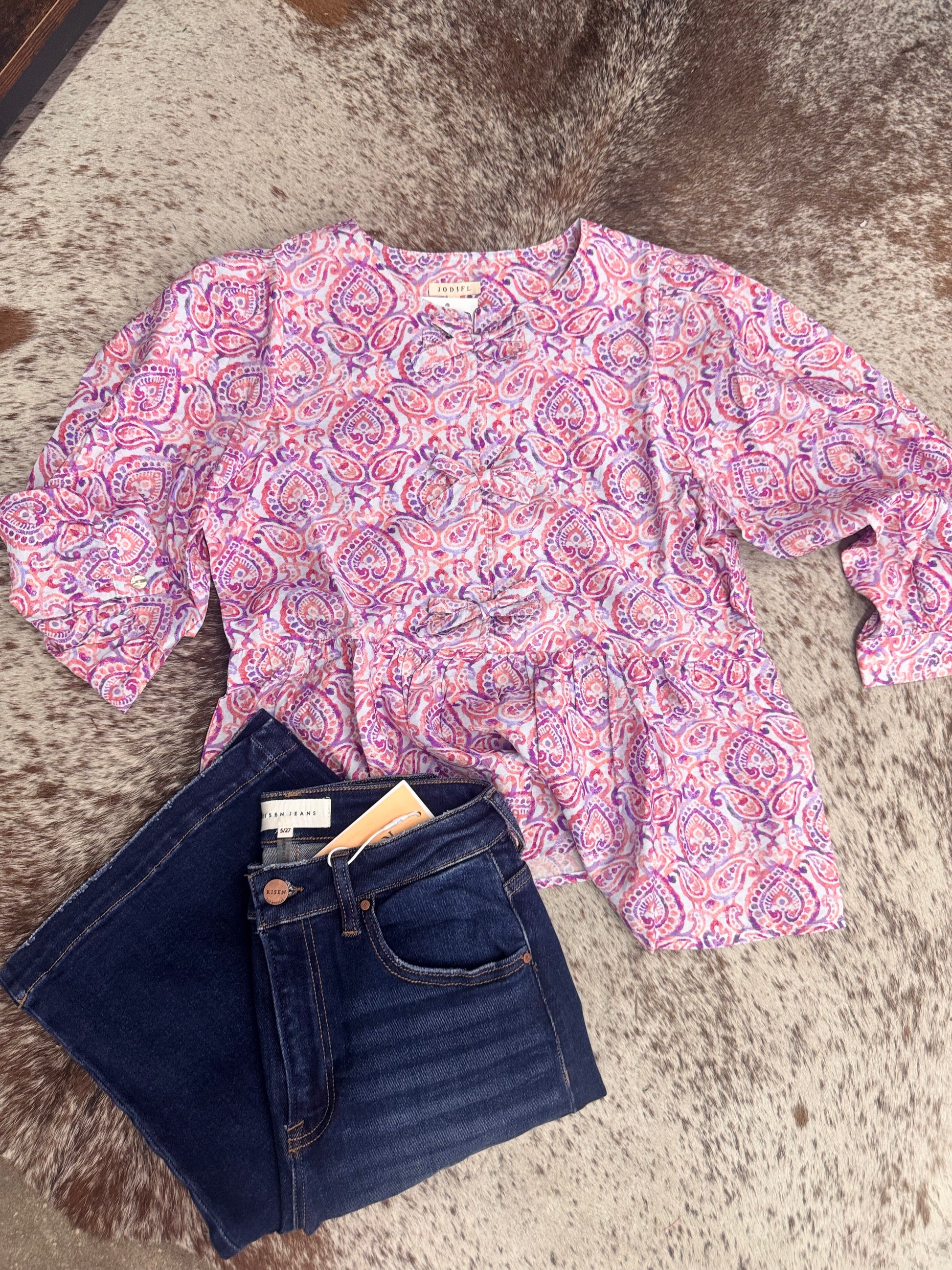 Paisley print peplum top with U-neck featuring ribbon tie, three quarter peasant sleeves, and band cuffs.